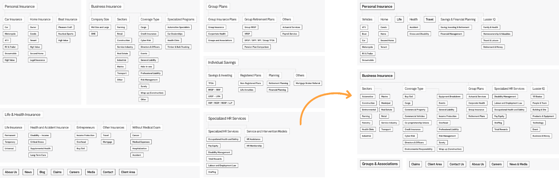 For the website, I streamlined the complex original sitemap into a clear, intuitive structure with dedicated hubs for three distinct audiences: personal insurance, business insurance and finance, and group plans.